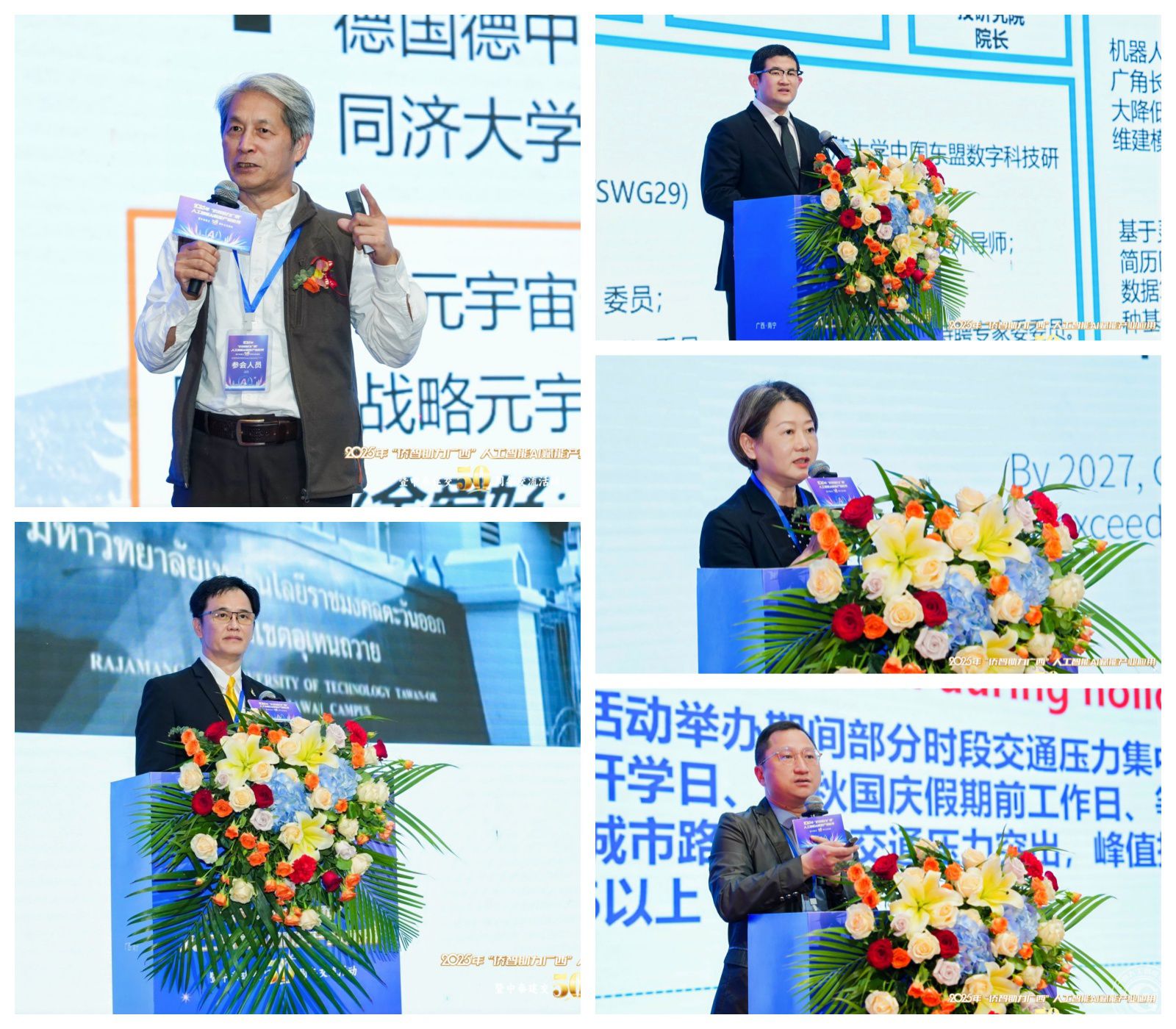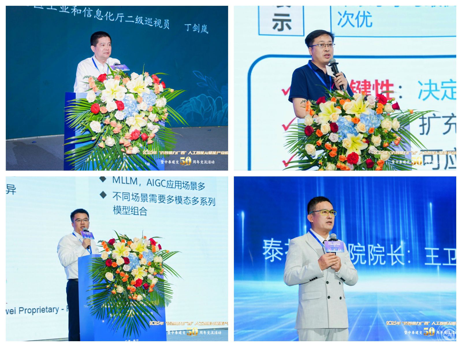 人工智能领域政企校代表也受邀上台作人工智能赋能产业主题推介。广西壮族自治区工业和信息化厅二级巡视员丁剑岚作《智启东盟·慧聚广西——AI赋能区域发展新机遇》分享;广西科学院新一代信息技术研究所/高端装备研究所所长王晓琳作《积圭成池·数智启航——人工智能+领域成果展示》分享;华为技术有限公司广西云业务部解决方案总监覃帆作《昇腾云&大模型重塑千行百业,共赢AI新时代》分享;泰斗商学院院长王卫国作《泰抖国际携手共建AI赋能未来》分享。