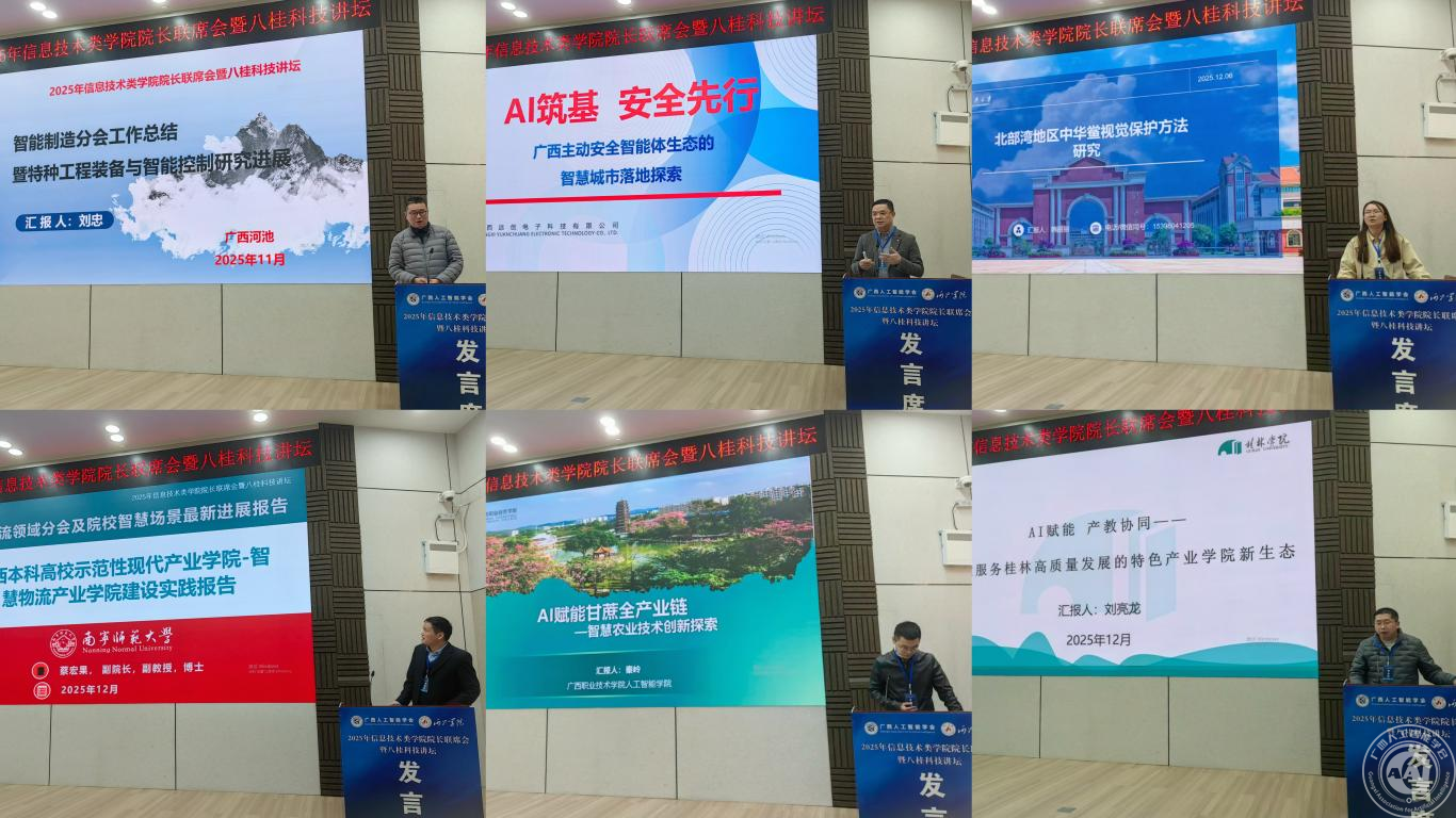 大会还邀请了6位学会领域分会、产教融合院校代表开展智慧场景最新进展报告。智能制造领域分会副主任委员刘忠教授作《特种工程装备与智能控制研究工作进展》报告;智慧城市领域分会委员陈春龙作《AI筑基·安全先行——广西主动安全智能体生态的智慧城市落地探索》报告;智慧海洋领域分会委员韩丽丽博士作《基于人工智能的海洋生物多样性保护方法研究》报告;智慧物流领域分会副主任委员蔡宏果博士作《本科高校示范性现代产业学院智慧物流产业学院建设实践报告》报告;智慧农业领域分会委员秦岭博士作《AI赋能甘蔗全产业链:智慧农业技术创新探索》报告;桂林学院信息工程学院副院长刘亮龙作《构建服务桂林高质量发展的特色产业学院新生态》报告。