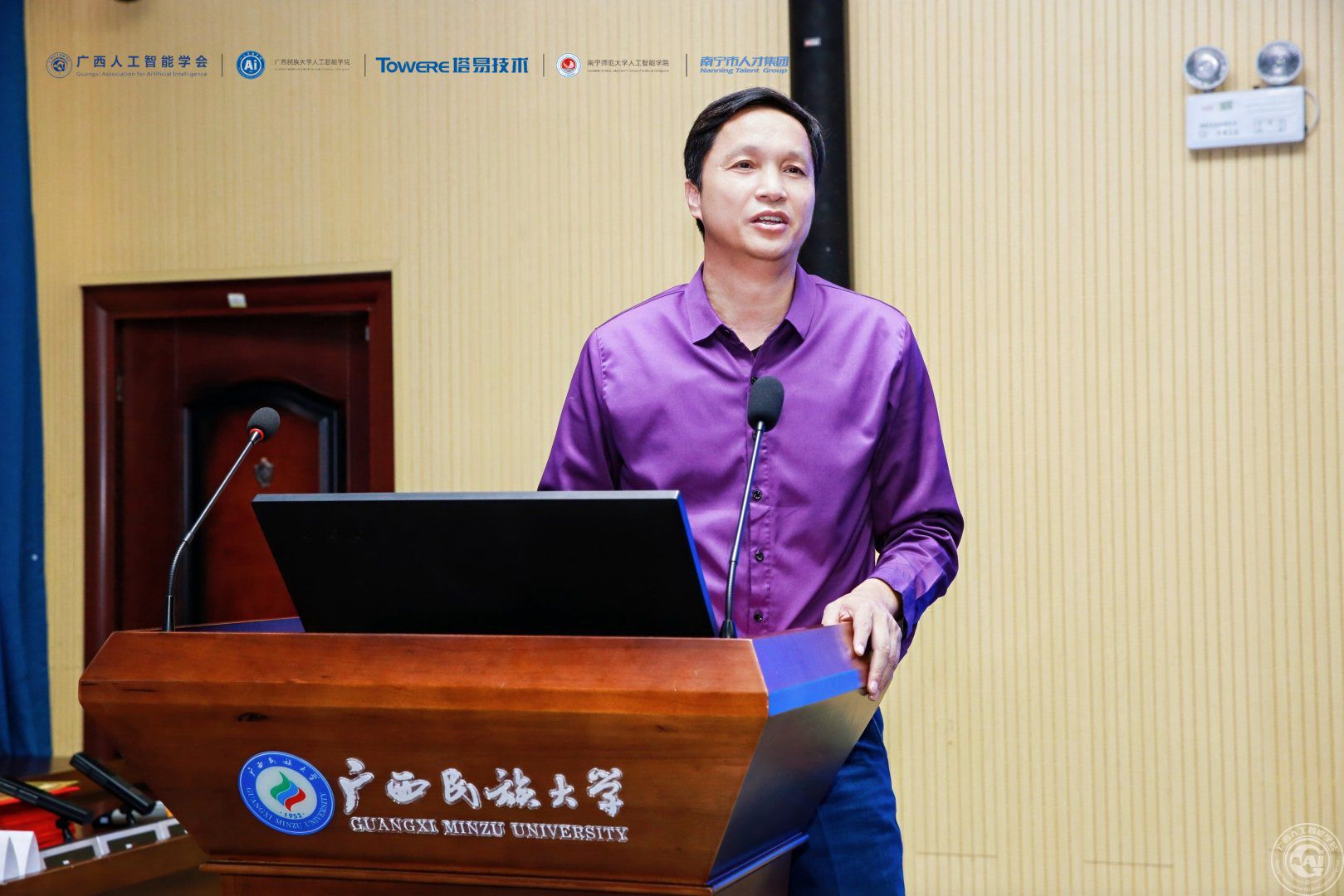 广西民族大学人工智能学院副院长文春明代表承办高校致欢迎辞。他表示,高校作为人才培养和科技创新的重要基地,将持续深化产教融合与校企合作,积极搭建高水平实践平台,助力学子将学术成果落地,成长为AI领域人才。