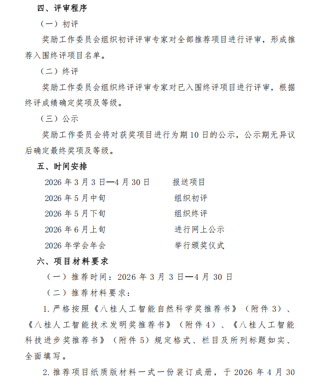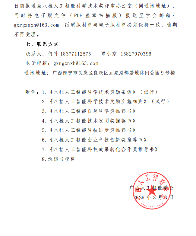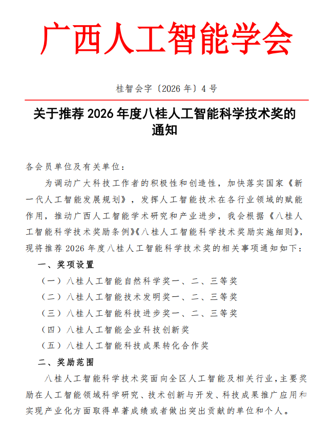 《关于推荐2026年度八桂人工智能科学技术奖的通知(桂智会字〔2026年〕4号)》