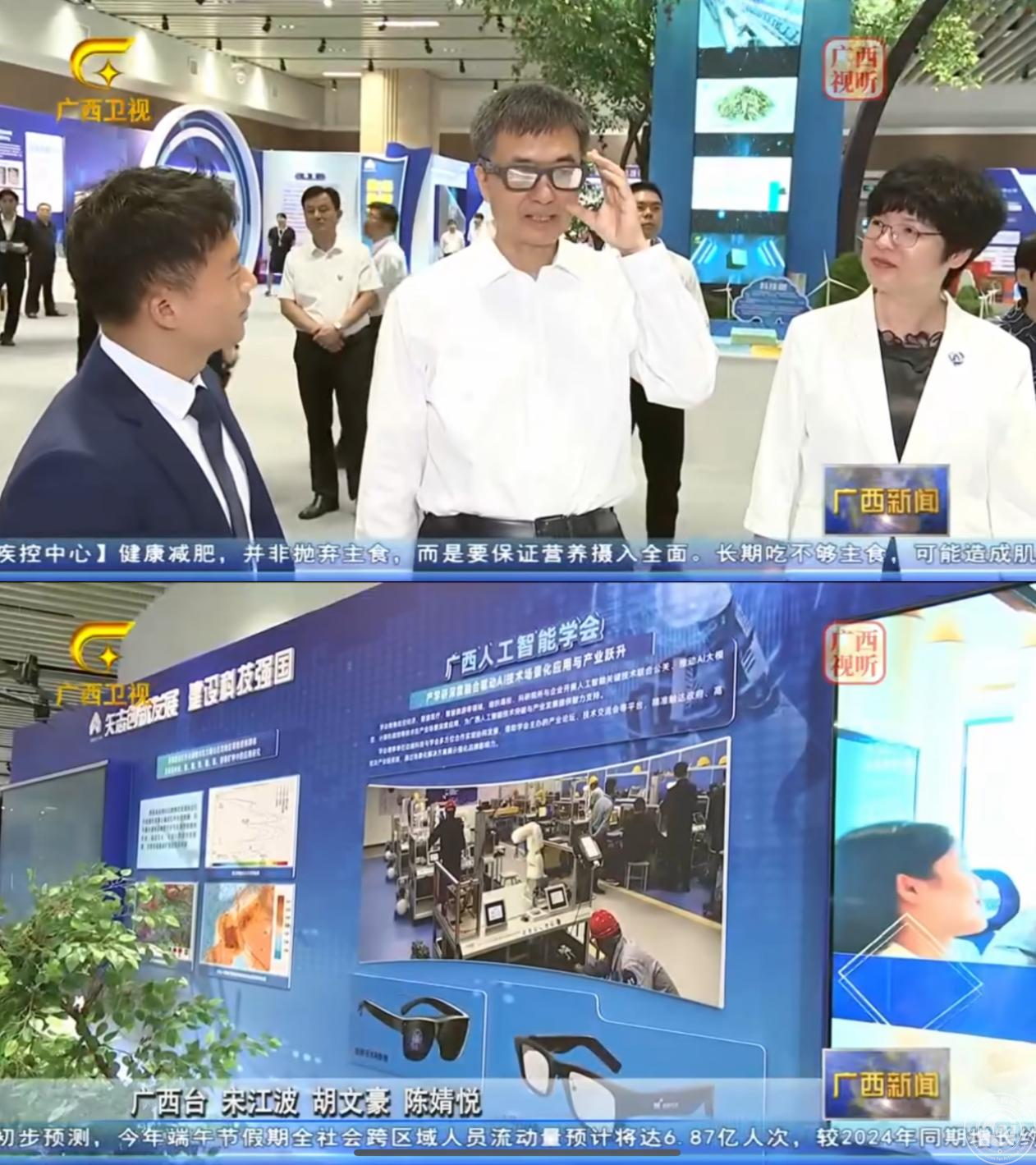 陈刚书记第一次戴此款眼镜是在今年530广西科技工作者日到广西科技馆考察时,广西人工智能学会理事单位迈越科技股份有限公司在学会的展位上展出,当时书记饶有兴致的体验了这款AI眼镜,其不仅具备传统眼镜的轻便外观,更通过镜片投影、语音交互、实时翻译等技术,将提词器、翻译机等功能集于一身。